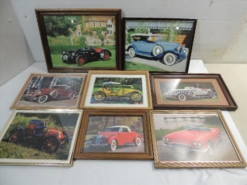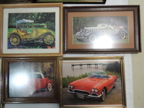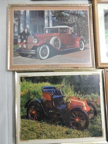 LOT 7 FRAMED PRINTS OF VINTAGE CARS: 1933 CHRYSLER, 1911 EMPIRE, 1930 PIERCE-ARROW AND MORE. AS SHOWN. VIEW PICTURE FOR DETAIL.