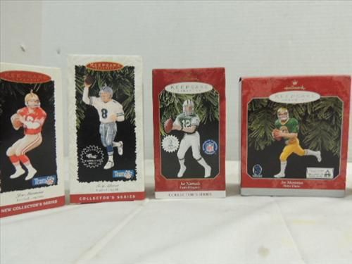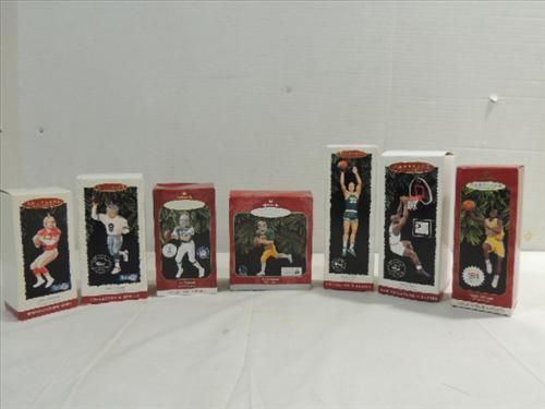 LOT 7 HALLMARK FOOTBALL & BASKETBALL ORNAMENTS: AIKMAN, MONTANA, BIRD, JOHNSON, NAMATH, O'NEAL. AS SHOWN. VIEW PICTURE FOR DETAIL.