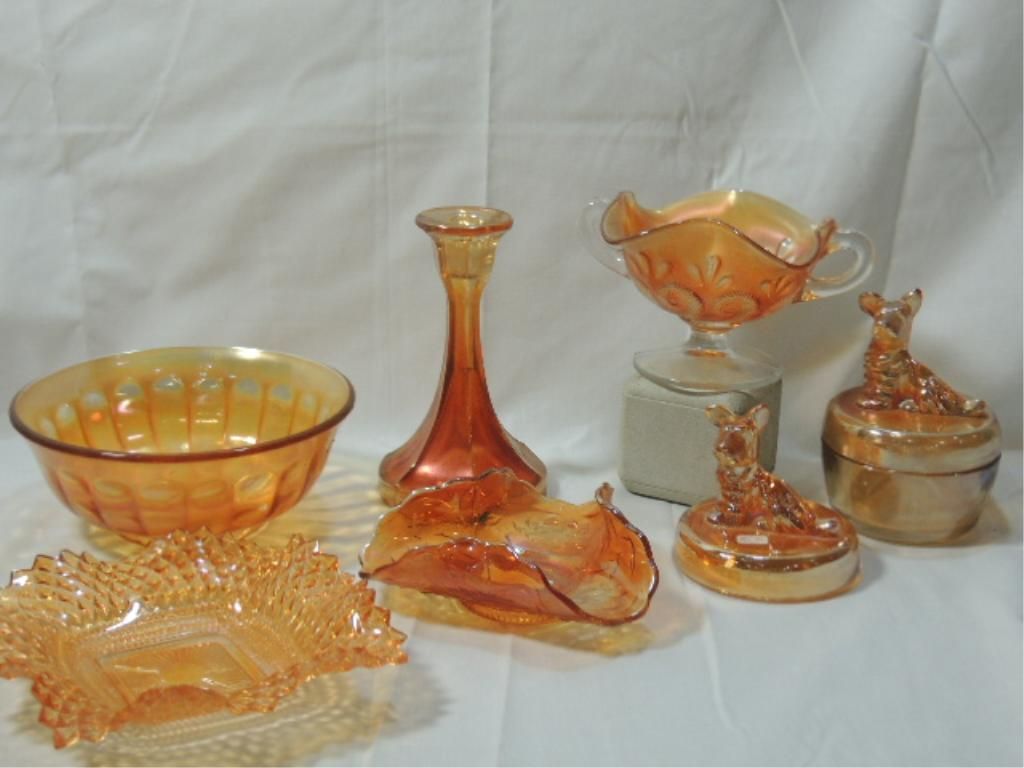 BOWLS, DISHES, CANDLE HOLDER, BOWL WITH LID, CANDY DISH, CARNIVAL GLASS. IRIDESCENT, AURORA GLASS, DOPE GLASS, RAINBOW GLASS, TAFFETA GLASS, MARIGOLD, ORANGE.