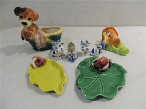 LOT 7 MID CENTURY MODERN LEAF TRAYS, WALL POCKET, DOG PLANTER AND 3 DELFT COWS. AS SHOWN. VIEW PICTURE FOR DETAIL.