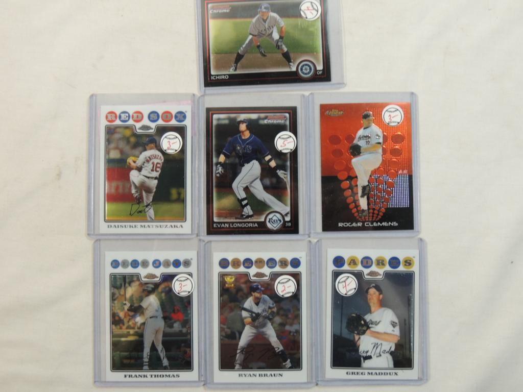 ROGER CLEMENS, EVAN LONGORIA, ICHIRO, GREG MADDUX, RYAN BRAUN, FRANK THOMAS, DAISUKE MARSUZAKA BASEBALL PLAYER CARDS. TRADING CARDS. COLLECTIBLE. BASEBALL MEMORABILIA. GOOD CONDITION AS SHOWN. SEE PHOTO FOR MORE DETAILS.