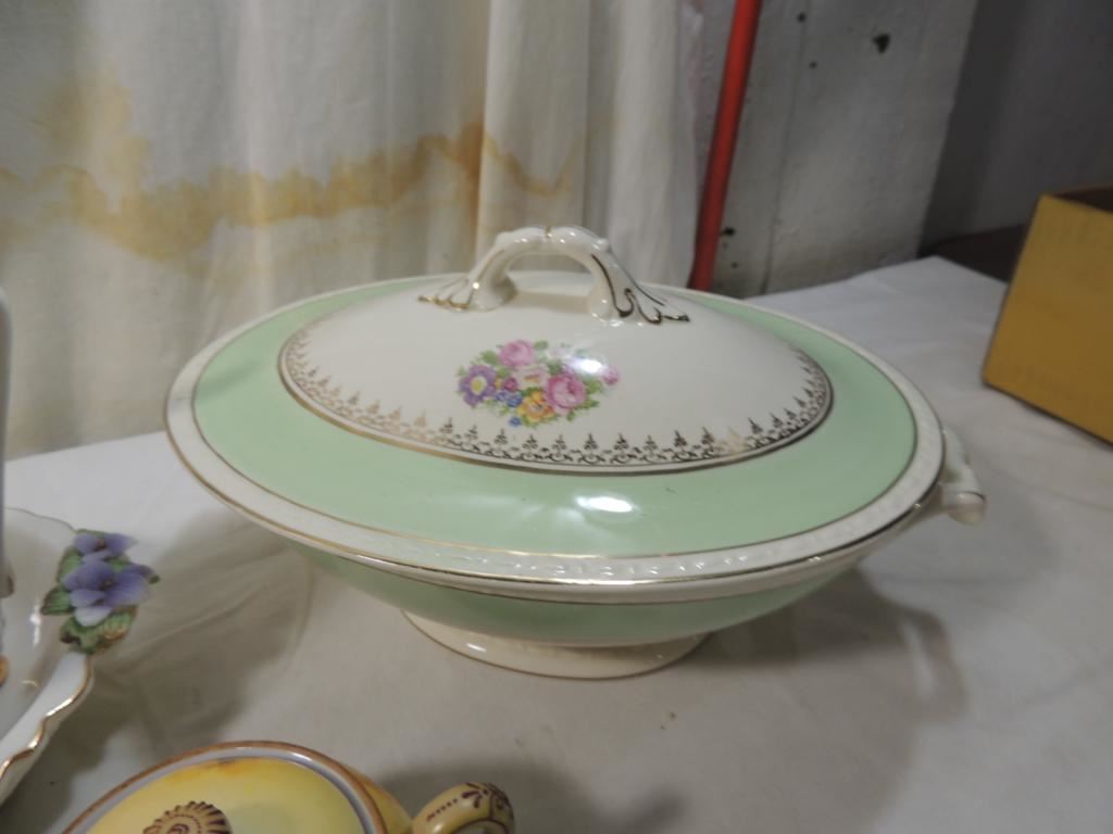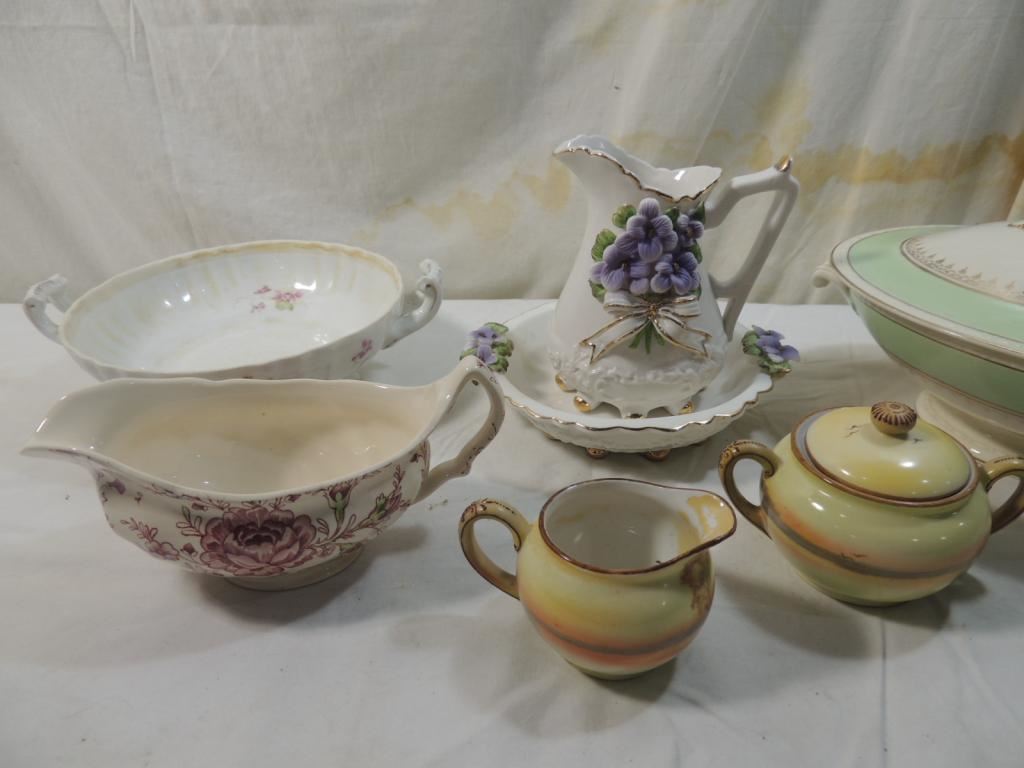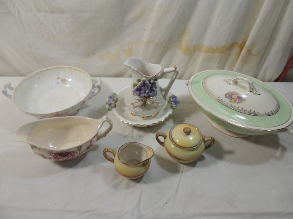 COVERED CASSEROLE DISH, PITCHER, BOWL, CREAMER, SUGAR BOWL, GRAVY BOWL, DECORATIVE, VINTAGE, AS SHOWN SEE PHOTO FOR MORE DETAILS