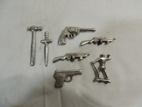 LOT 7 VINTAGE ARCADE DIE CAST MINIATURES: 4 GUNS, KNIFE, HAMMER & FRONTIERSMAN. AS SHOWN. VIEW PICTURE FOR DETAIL.
