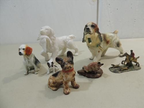 LOT 7 VINTAGE CAST IRON & CERAMIC DOGS: 1 CAST IRON BULL TERRIER, 4 CERAMIC HUNTING DOGS AND BRASS FOX HUNT. AS SHOWN. VIEW PICTURE FOR DETAIL.