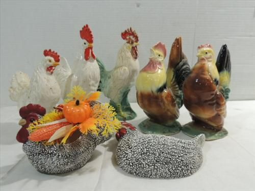 LOT 7 VINTAGE CERAMIC ROOSTER & HEN SETS. HAND PAINTED. AS SHOWN. VIEW PICTURE FOR DETAIL.