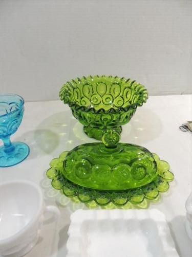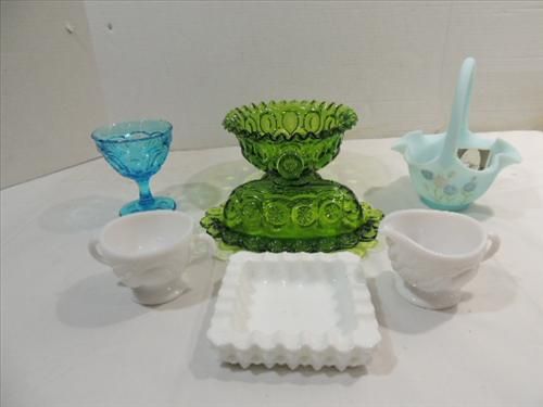 LOT 7 VINTAGE FENTON GLASSWARE, 1 SIGNED BY ARTIST. COMPOTE, BUTTER DIS, FOOTED BOWL AND MORE. AS SHOWN. VIEW PICTURE FOR DETAIL.