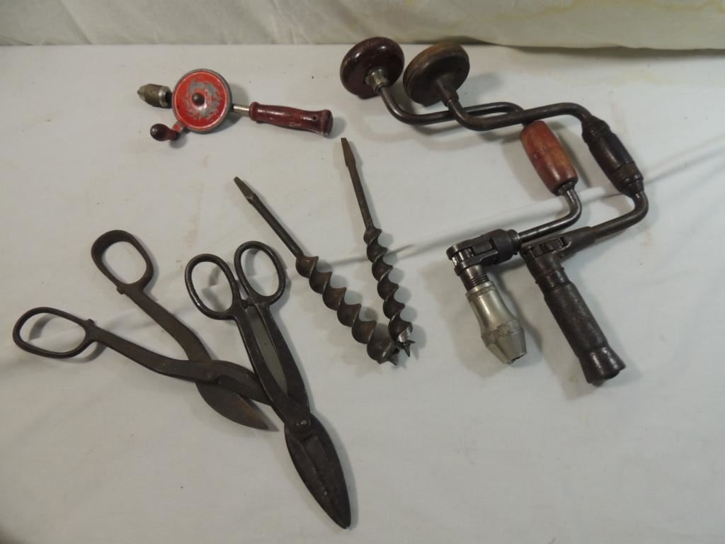 VINTAGE HAND DRILLS, DRILL BITS, HAND DRILL METAL CUTTER AS SHOWN SEE PHOTO FOR MORE DETAILS.