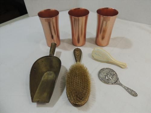 LOT 7 VINTAGE ITEMS: BRASS SCOOP, 2 OLD HAIR BRUSHES AND A SMALL METAL MIRROR, (3) VINTAGE BASCAL ALUMINUM TUMBLERS. AS SHOWN. VIEW PICTURE FOR DETAIL.