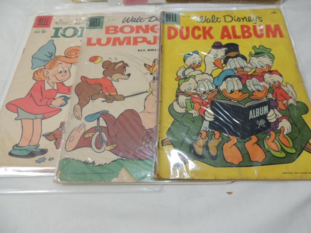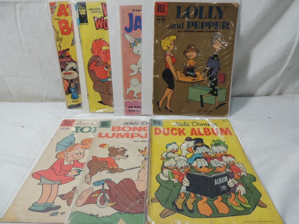 VINTAGE OLD COMICS. WALT DISNEY DUCK ALBUM, WALT DISNEY BONGO AND LUMPJAW, JIMMY HALTOS LITTLE IODINE, LOLLY AND PEPPER, JACK AND JILL, FRISKY ANIMALS, WOODY WOODPECKER, ATOMIC BUNNY. AS SHOWN. SEE PHOTO FOR MORE DETAILS.