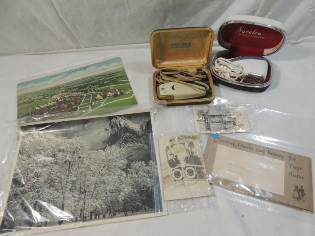 LOT 7 VINTAGE POSTCARD, PHOTOS & RAZORS