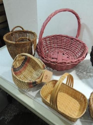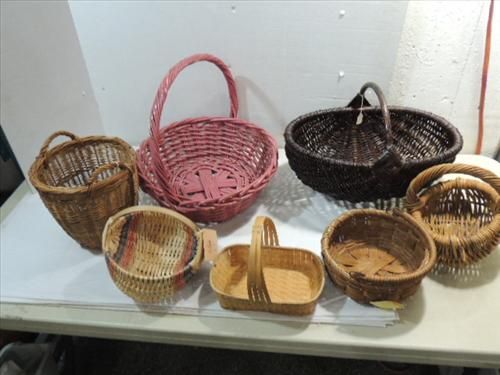 LOT 7 VINTAGE REED WOVEN ASSORTED SIZES BASKETS. AS SHOWN. VIEW PICTURE FOR DETAIL.