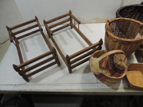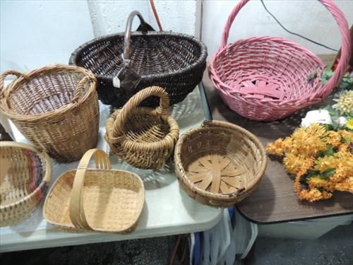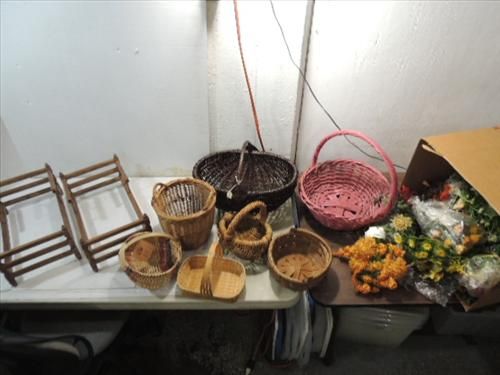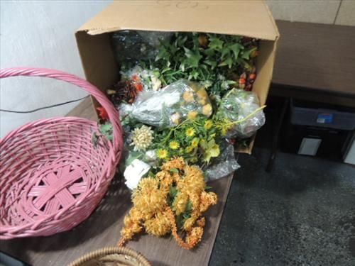 LOT 7 VINTAGE REED WOVEN ASSORTED SIZES BASKETS & VINTAGE PLASTIC PLANTS ASSORTED STYLES AND COLORS. AS SHOWN. VIEW PICTURE FOR DETAIL.