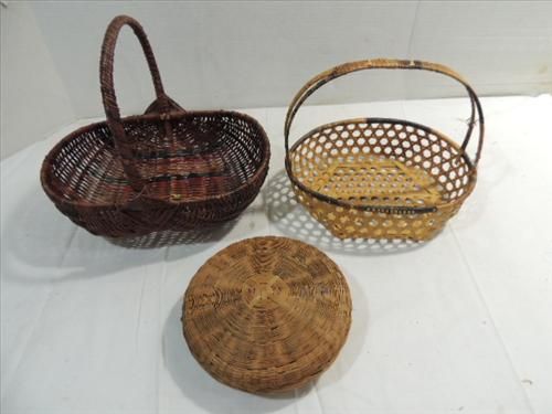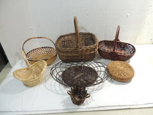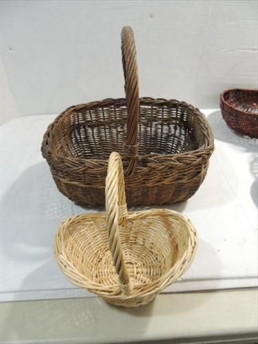 LOT 7 VINTAGE REED WOVEN HAND & TABLE BASKETS. AS SHOWN. VIEW PICTURE FOR DETAIL.