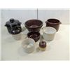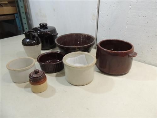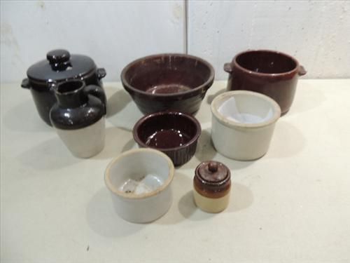 LOT 7 VINTAGE STONEWARE & MARCREST MIXING BOWL, SALT GLAZE JUGS & CROSKS. AS SHOWN. VIEW PICTURE FOR DETAIL.