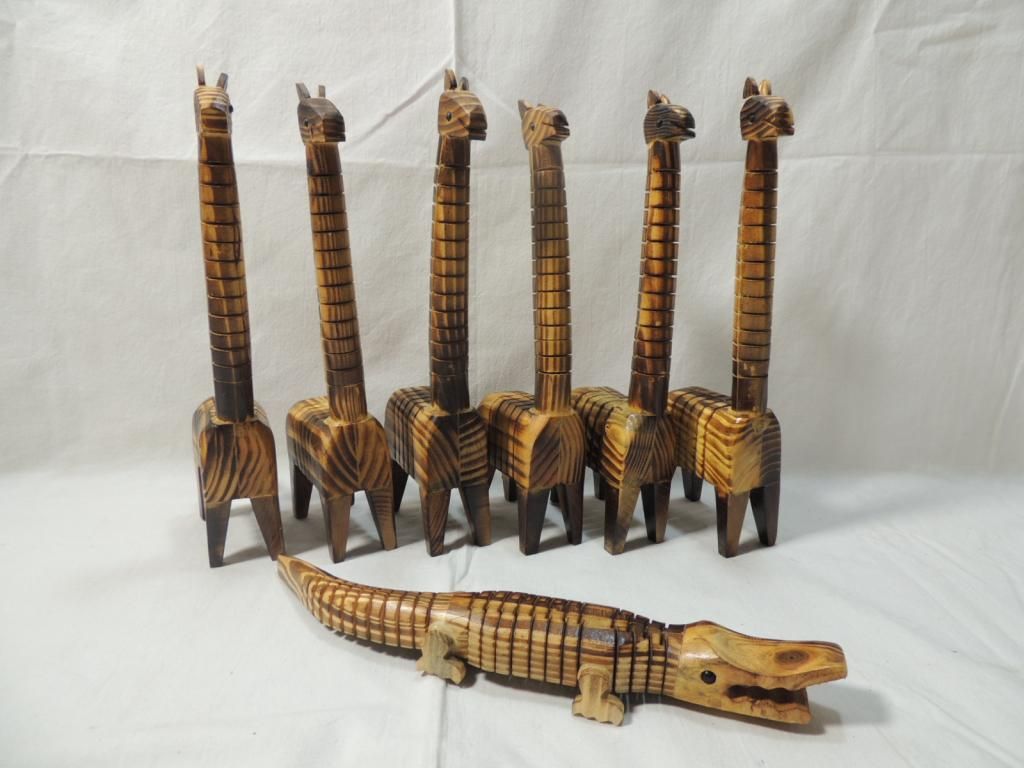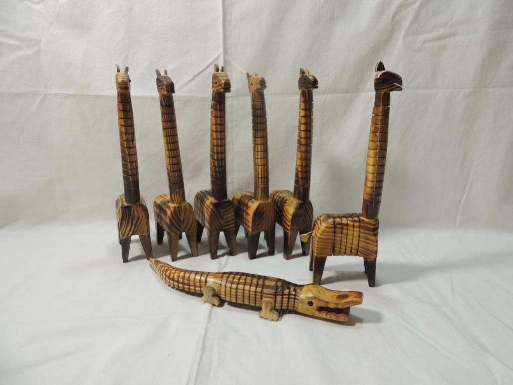 7 WOODEN ARTICULATED FOLK ART ALLIGATOR AND GIRAFFE AS SHOWN. SEE PHOTO FOR MORE DETAILS.