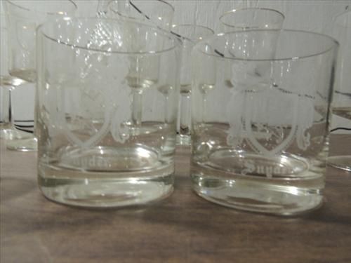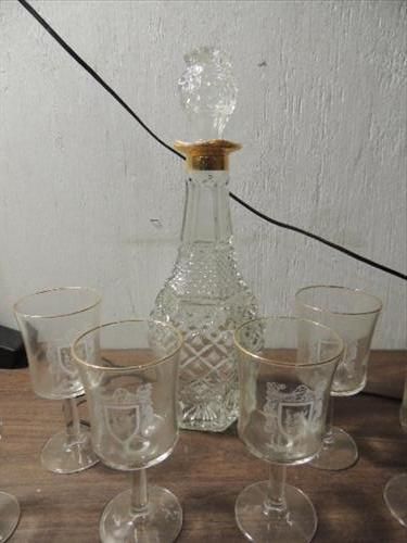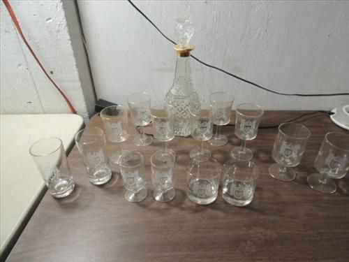 LOT 71 AMERICAN HERITAGE MATCHING STEMWARE: 1 WINE DECANTER & 6 MATCHING GLASSES, 16 EACH 4 STYLE OF STEMWARE. ALL ETCHED WITH COAT OF ARMS. AND THE NAME SNYDER. AS SHOWN. VIEW PICTURE FOR DETAIL.