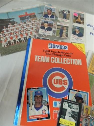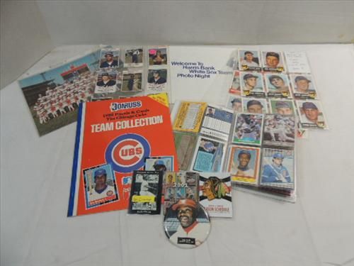 LOT 72 CHICAGO CUBS & WHITE SOX BASEBALL CARDS, TEAM PHOTO, PIN, AND MORE. MOST FROM THE 1970S. AS SHOWN. VIEW PICTURE FOR DETAIL.
