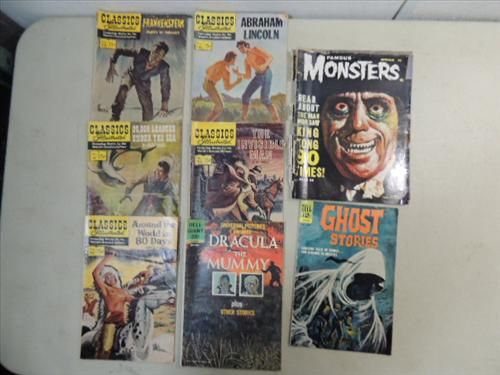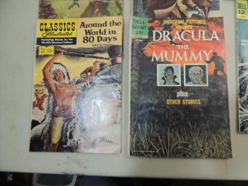 LOT 8 1945-60 GOLD & SILVER AGE COMICS: CLASSIC ILLUSTRATED, DELL GIANT DRACULA & MUMMY AND MORE. AS SHOWN. VIE WPICTURE FOR DETAIL.