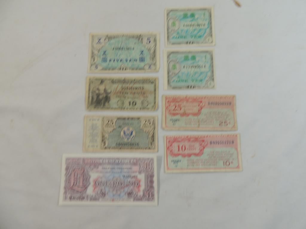 ASSORTED FOREIGN MILITARY CURRENCY VINTAGE AS SHOWN SEE PHOTO FOR MORE DETAILS.