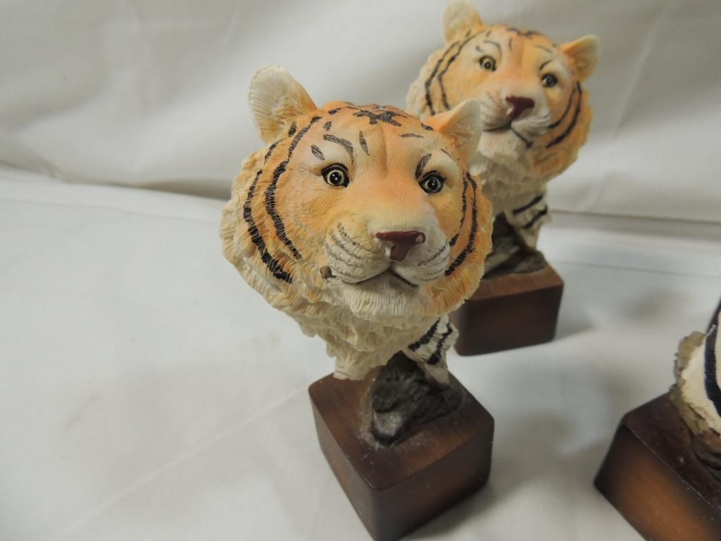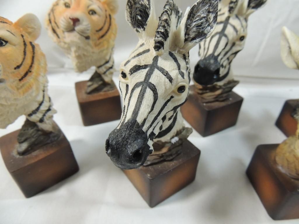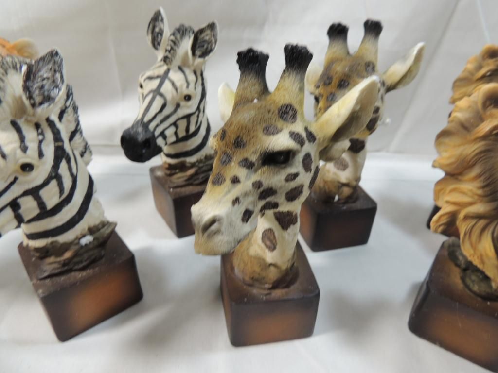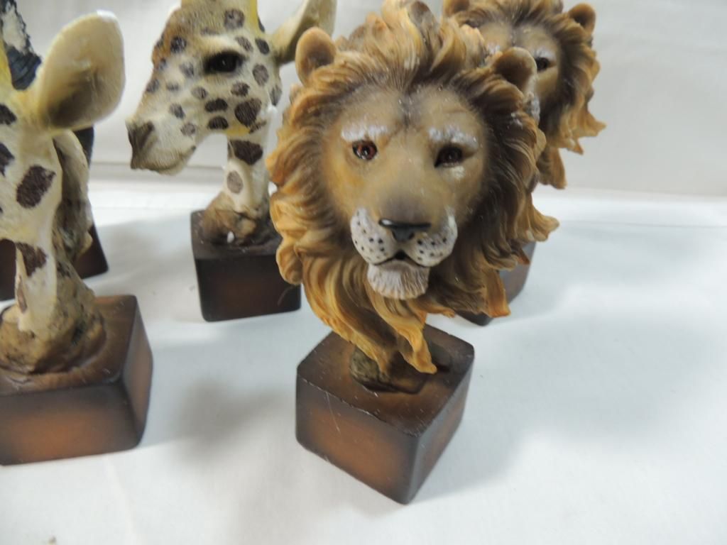 5.75" SAFARI ANIMAL BUST. 4 DIFFERENT ANIMALS. 2 EACH LIONS, ZEBRA, GIRAFFE, TIGER, AS SHOWN. SEE PHOTO FOR MORE DETAILS.