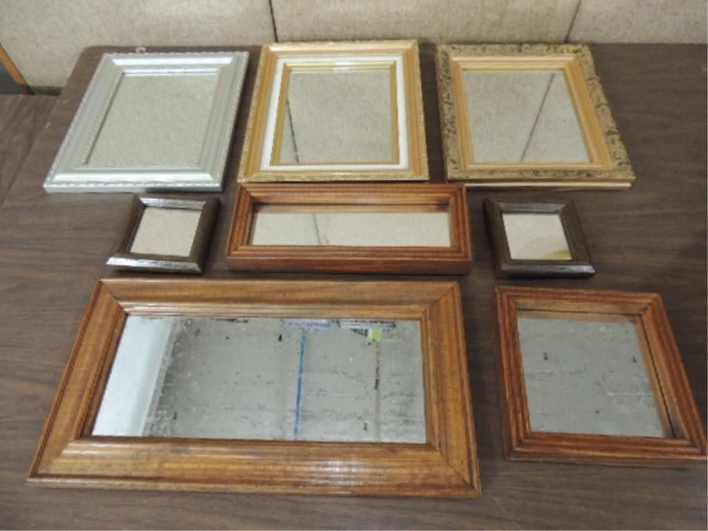 LOT 8 FRAMED ASSORTED SIZE & STYLE DECORATIVE ACCENT WALL MIRRORS. AS SHOWN. VIEW PICTURE FOR DETAIL.
