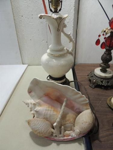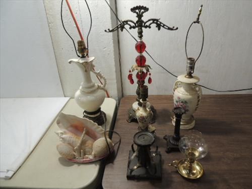 LOT 8 ASSORTED VINTAGE LAMPS & CANDLE HOLDERS. VARIOUS STYLE AND COMPOSITION. AS SHOWN. VIEW PICTURE FOR DETAIL.