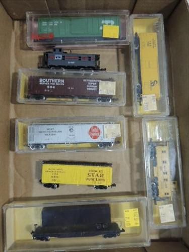 LOT 8 ATLAS N GAUGE TRAIN CARS: 5 BOX CARS, 2 CABOOSE AND 1 FLAT CAR. AS SHOWN. VIEW PICTURE FOR DETAIL.