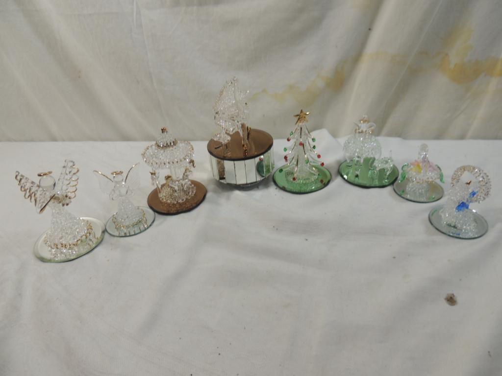 DECORATIVE GLASS BLOWN FIGURES, SMALL FIGURES, DELICATE MIRROR BASE, TEA SET, CARISAL, CHRISTMAS TREE, DOLPHINS, FLOWER BASKET, PIANO, AS SHOWN SEE PHOTO FOR MORE DETAILS.