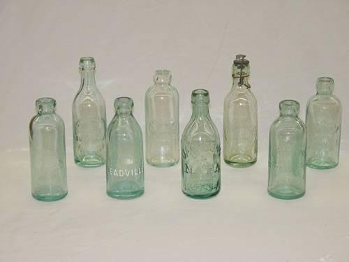 LOT (8) BOTTLES - 5 HUTCH STYLE and 3 BLOB TOPS (SODA and BEER BOTTLES) - ALL AQUA;