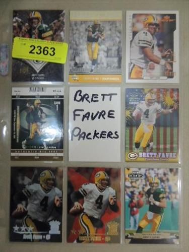 LOT 8 BRETT FARVE PACKERS FOOTBALL PLAYER CARDS. AS SHOWN. VIEW PICTURE FOR DETAIL.
