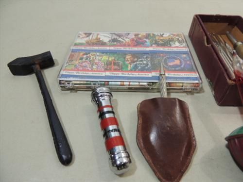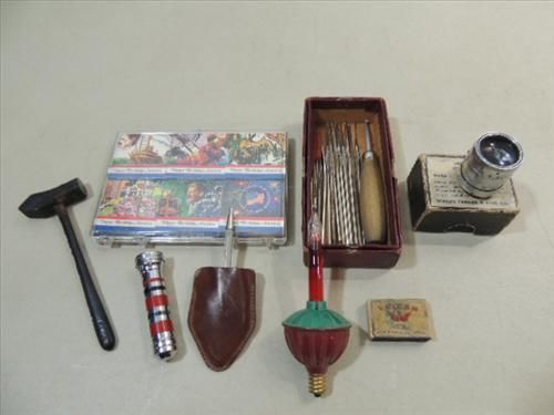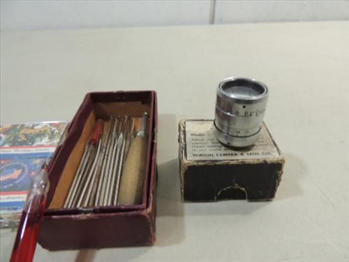 LOT 8 COLLECTIBLES: ANTIQUE WIRGIN CAMERA LENS FOR BAUCH & LUMB F-28 CAMERA, VINTAGE CHROCHET HOOKS, HOLIDAY BUBBLE LIGHT, MATCHBOOKS AND MORE.  AS SHOWN.  VIEW PICTURE FOR DETAIL.