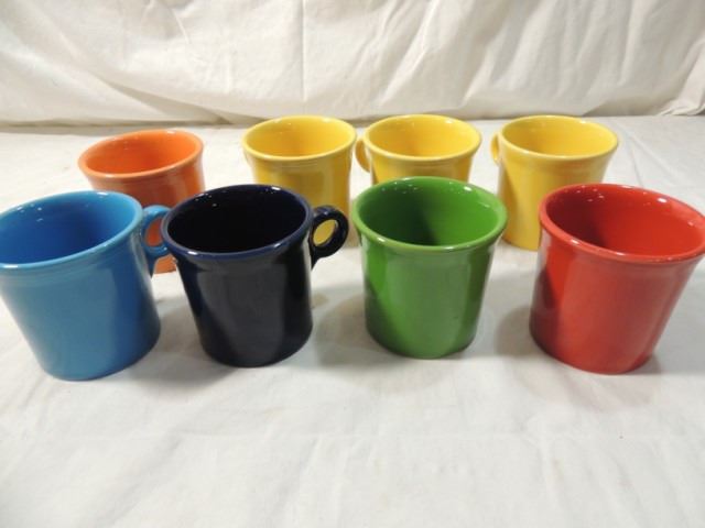 LOT OF 8 FIESTA WARE FIESTAWARE COFFEE MUGS, IN VARIOUS COLORS, AS SHOWN. NO CHIPS, CRACKS, ETC. PERFECT CONDITION.