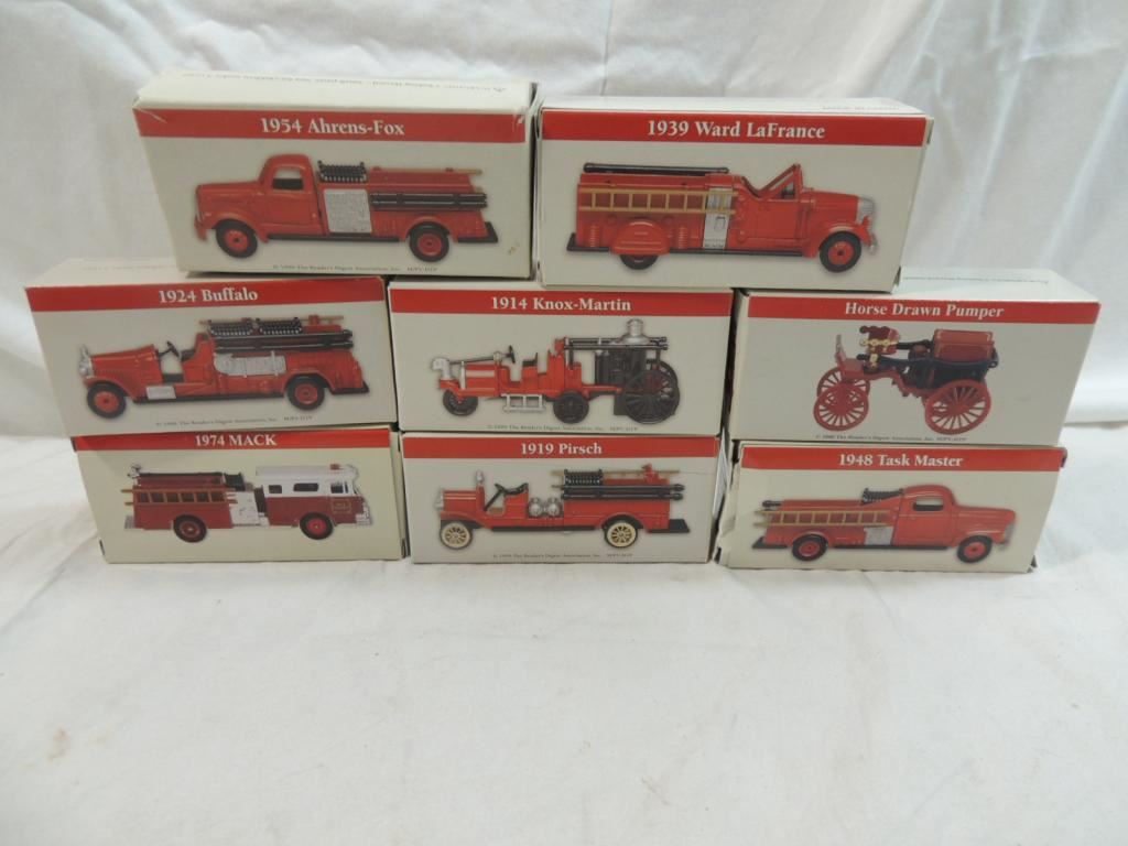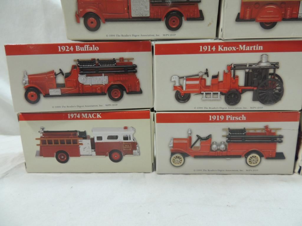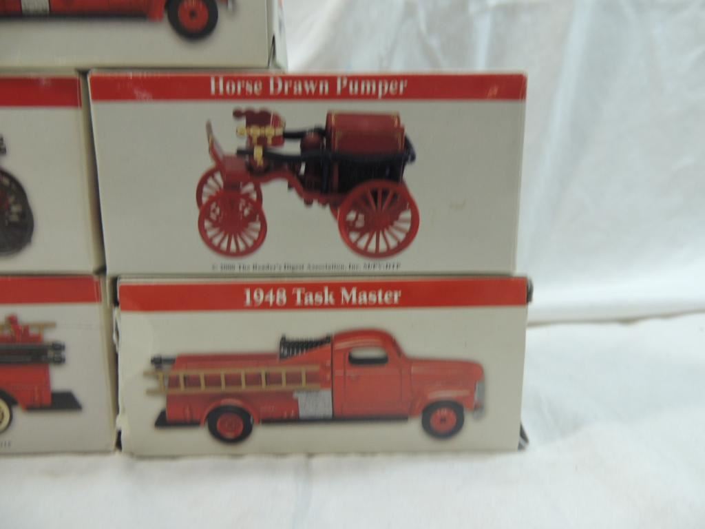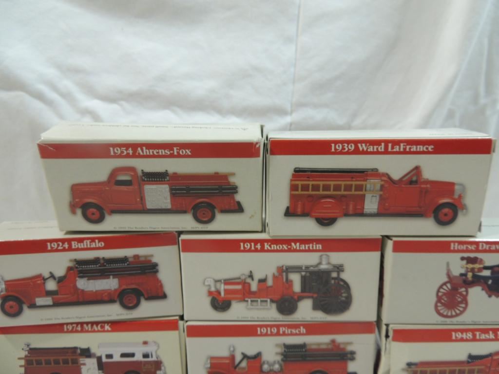 READERS DIGEST VARIOUS FIRE TRUCKS THROUGHOUT THE YEARS, HORSE DRAWN PUMPER, TASK MASTER, AHRENS FOX, MACK, BUFFALO, KNOX MARTIN, PIRSCH, WARD LAFRANCE MINATURE REPLICAS AS SHOWN SEE PHOTO FOR MORE DETAILS