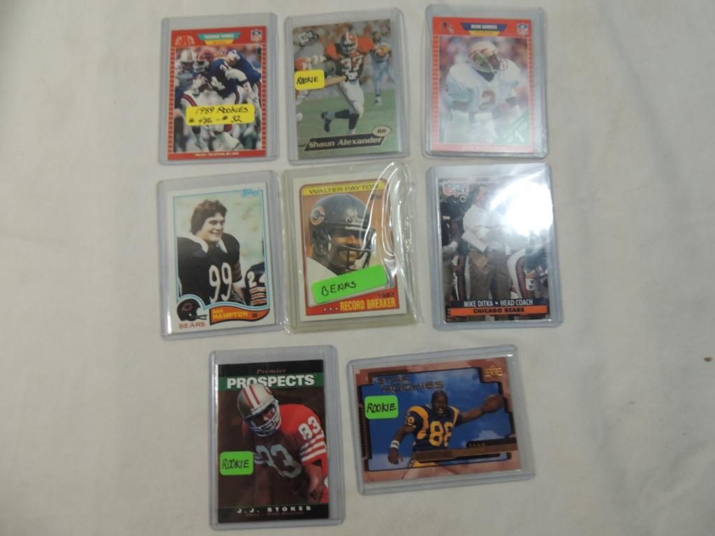8 FOOTBALL CARDS. SEAHAWKS SHAUN ALEXANDER, BILLS THURMAN THOMAS, FALCONS SANDERS, BEARS HAMPTONS, BEARS PAYTON, BEARS DITKA, RAMS HOLT, 49ERS STOKES. FOOTBALL PLAYER CARDS. TRADING CARDS. COLLECTIBLE. FOOTBALL MEMORABILIA. GOOD CONDITION AS SHOWN. SEE PH