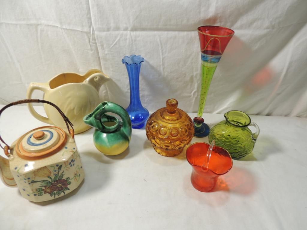 VASES, GLASSWARE, TEA POT, BASKET, GLASSWARE, CERAMICS. AS SHOWN. SEE PHOTO FOR MORE DETAILS.