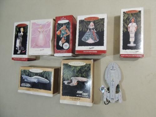 LOT 8 KEEPSAKE ORNAMENTS: 3 STAR TREK, 2 BARBIE AND MORE. AS SHOWN. VIEW PICTURE FOR DETAIL.