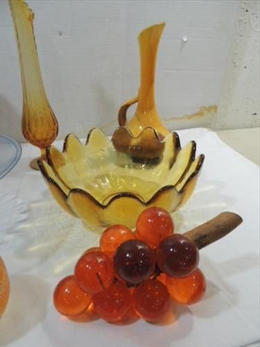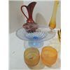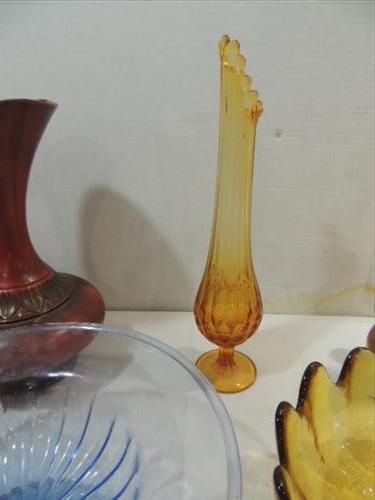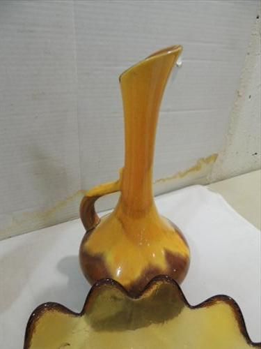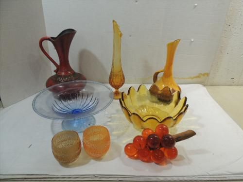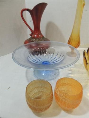 LOT 8 MID CENTURY MODERN GLASS & CERAMIC DECORATIVE BLUE GLASS BOWL, BRONZE GLASS ?VIKING? VASE & BOWL, 2 CERAMIC PITCHERS. AS SHOWN. VIEW PICTURE FOR DETAIL.