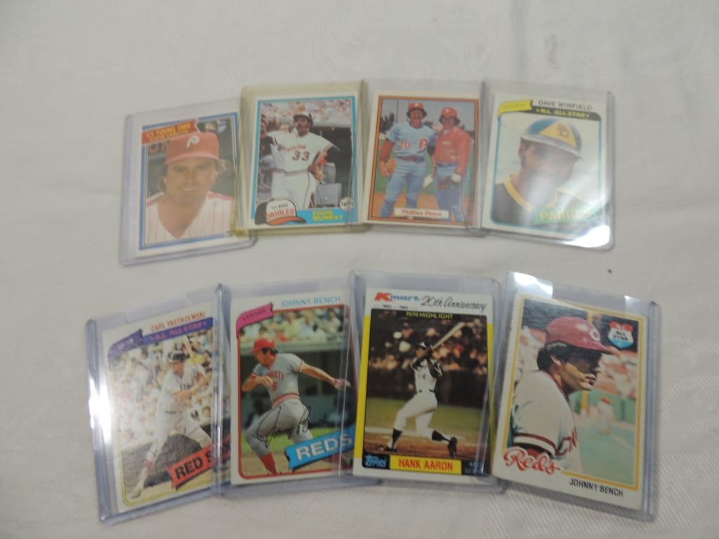 JOHNNY BENCH, HANK AARON, JOHNNY BENCH, CARL YASTRZEMSKI, DAVE WINFIELD, PHILLIES, FINEST, EDDIE MURRAY, CY YOUNG BASEBALL PLAYER CARDS. TRADING CARDS. COLLECTIBLE. BASEBALL MEMORABILIA. GOOD CONDITION AS SHOWN. SEE PHOTO FOR MORE DETAILS.