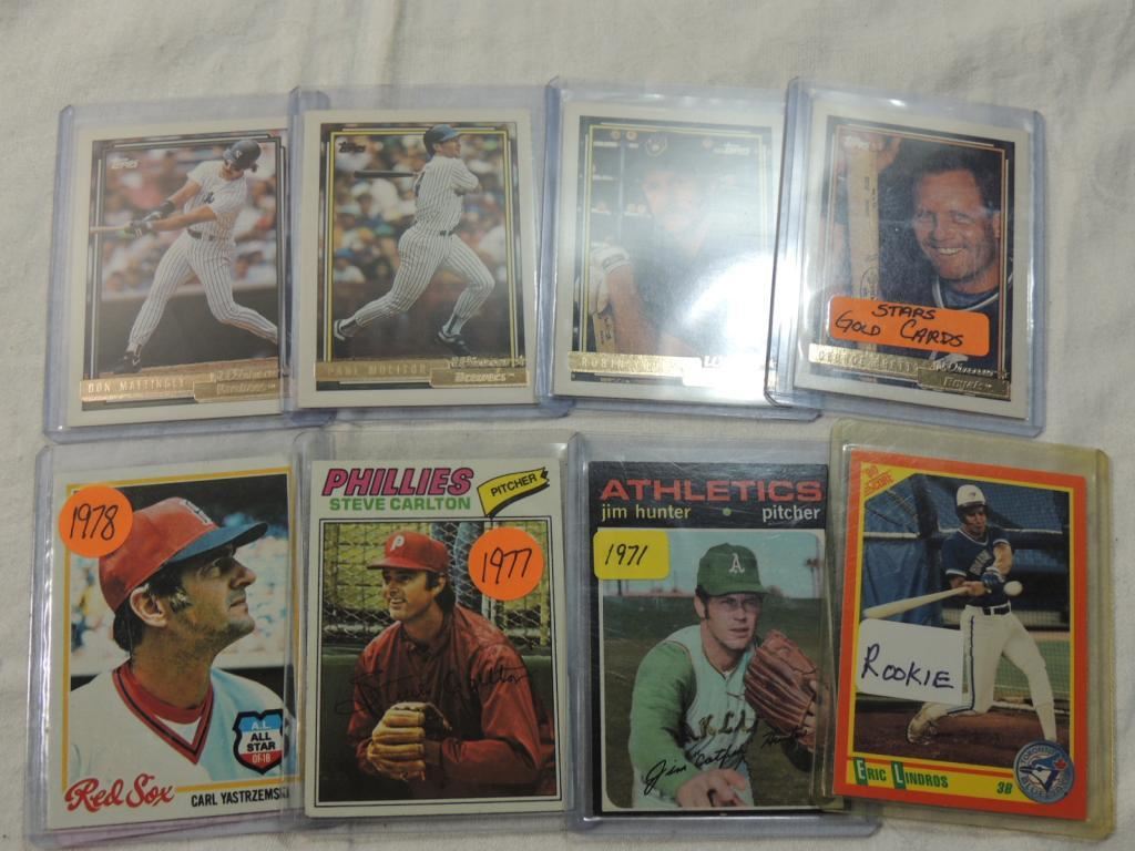 1977 STEVE CARLTON & 1978 CARL YASTRZEMSKI 1990 SCORE ERIC LINDROS #100T ROOKIE CARD 1971 TOPPS JIM HUNTER #45 GEORGE BRETT, ROBIN YOUNT, PAUL MOLITOR, DON MATTINGLY BASEBALL PLAYER CARDS. TRADING CARDS. COLLECTIBLE. BASEBALL MEMORABILIA. GOOD CONDITION AS SHOWN. SEE PHOTO FOR MORE DETAILS