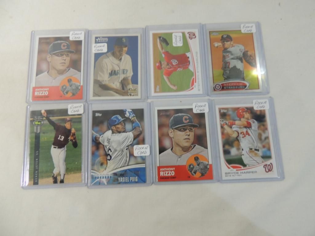 STEPHEN STRASBURG, DEREK JETER, BRYCE HARPER, YASIEL PUIG, ANTHONY RIZZO, ADAM JONES, BASEBALL PLAYER CARDS. BASEBALL TRADING CARDS. COLLECTIBLE. PROTECTIVE PLASTIC SLEEVE. SPORTS MEMORABILIA.. GOOD CONDITION. AS SHOWN SEE PHOTO FOR MORE DETAILS.