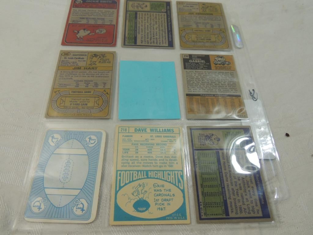 JOE FERFUSON, MEL GRAY, JACKIE SMITH, ROMAN GABRIEL, JIM HART, JACK SNOW, DAVE WILLIAMS, FOOTBALL PLAYER CARDS. TRADING CARDS. COLLECTIBLE. FOOTBALL MEMORABILIA. GOOD CONDITION AS SHOWN. SEE PHOTO FOR MORE DETAILS.