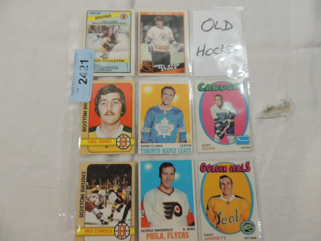 DICK MIDDLETON, RAY BOURQUE, CAROL VADNAIS, NORM ULLMAN, GARY DOAK, FRED STANFIELD, GEORGE SWARBRICK, GARY HARRETT HOCKEY PLAYER CARDS. TRADING CARDS. COLLECTIBLE. HOCKEY MEMORABILIA. GOOD CONDITION AS SHOWN. SEE PHOTO FOR MORE DETAILS