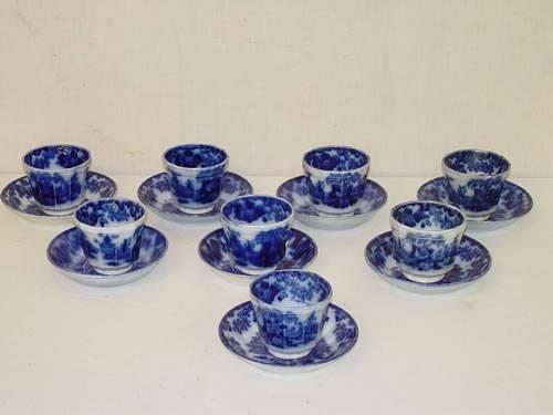 LOT (8) SCINDE FLOW BLUE HANDLESS CUPS & SAUCERS BY ALCOCK - MINOR REPAIRS & CHIPS TO SEVERAL CUPS;
