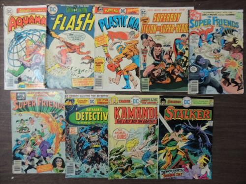 LOT 8 SILVER AGE DC SUPER HEREO COMIC BOOKS TITLES: AQUAMAN, FLASH, PLASTIC MAN, SUPER FRIENDS, BATMAN, STALKER. AS SHOWN. VIEW PICTURE FOR DETAIL.