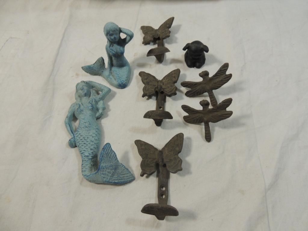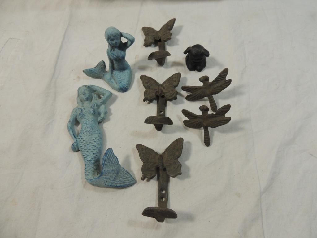 MERMAIDS, BUTTERFLIES, PUPPY, DRAGON FLY, VINTAGE HOOKS, CAST IRON VINTAGE, AS SHOWN SEE PHOTO FOR MORE DETAILS.