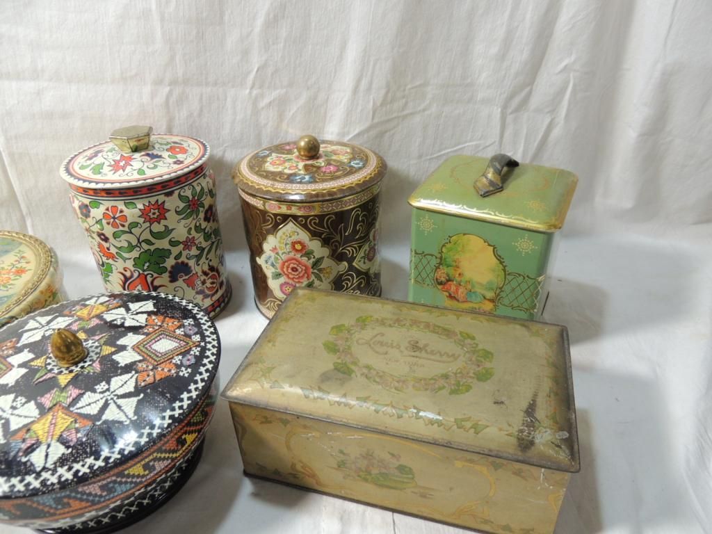 VINTAGE DECORATIVE TIN CONTAINERS. BOWLS, BOXES, CONTAINERS. AS SHOWN. SEE PHOTO FOR MORE DETAILS.