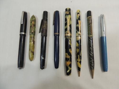 LOT 8 VINTAGE (6) FOUNTAIN INK PENS & 2 MECHANICAL PENCILS. ONE SET OF MATCHING PEN & PENCIL (BAKELITE EVERSHARP). AS SHOWN. VIEW PICTURE FOR DETAIL.