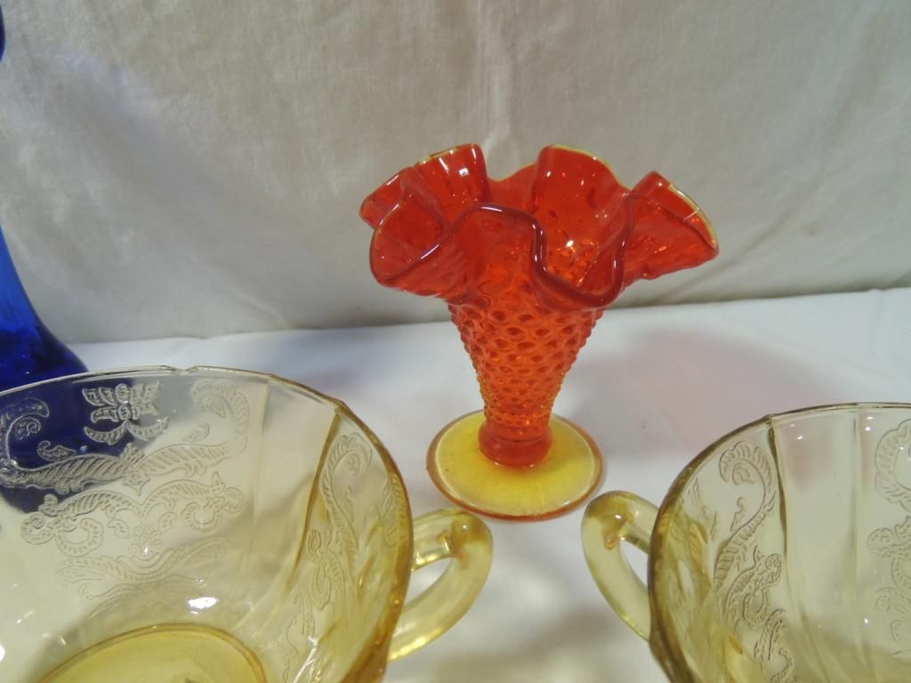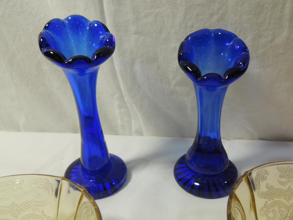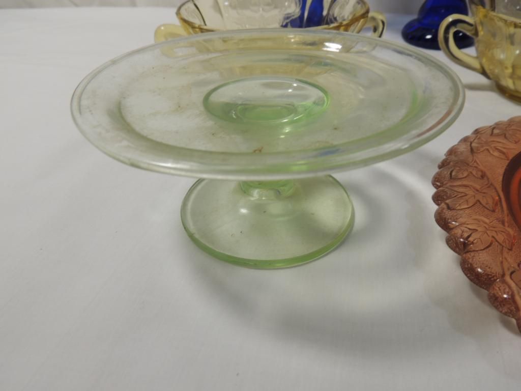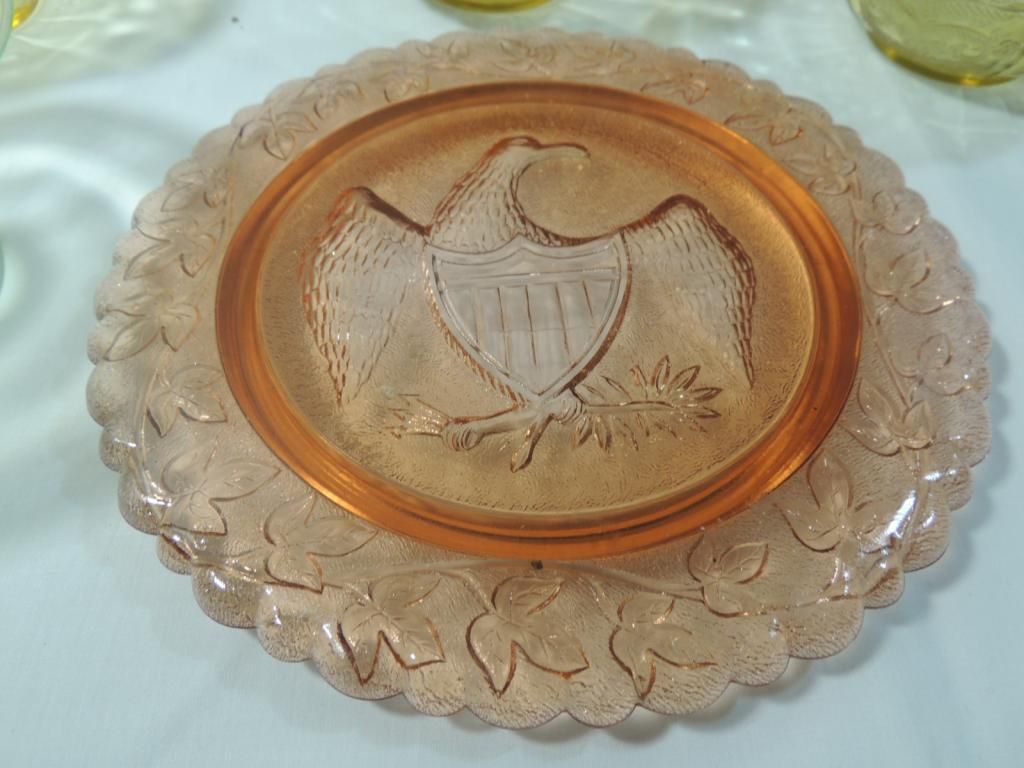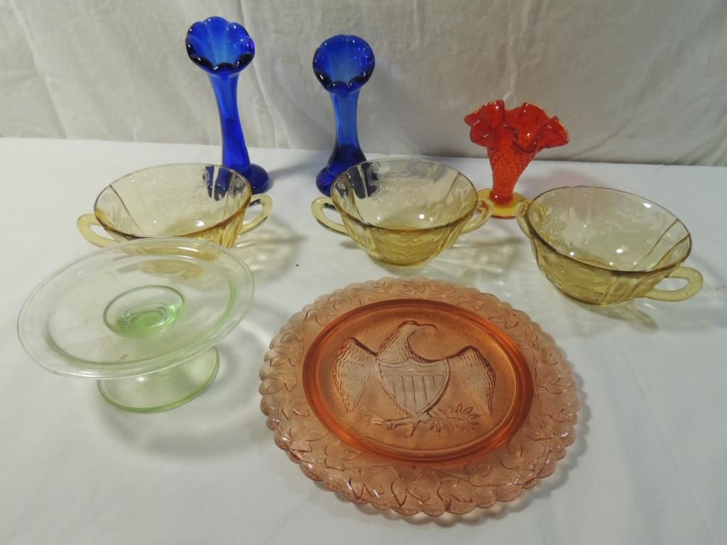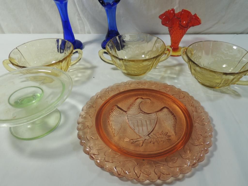 DEPRESSION GLASS, COBALT CANDLESTICKS, FENTEN AMBERINA, VASILINE GLASS? DECORATIVE BICENTENIAL PLATE. AS SHOWN SEE PHOTO FOR MORE DETAILS.