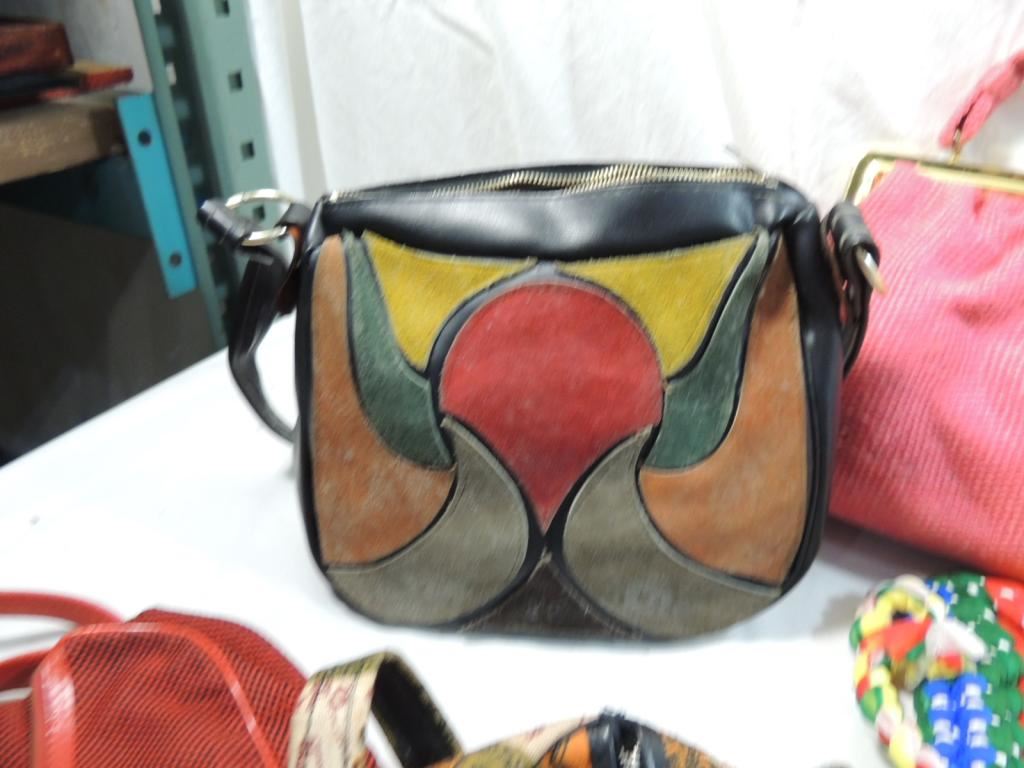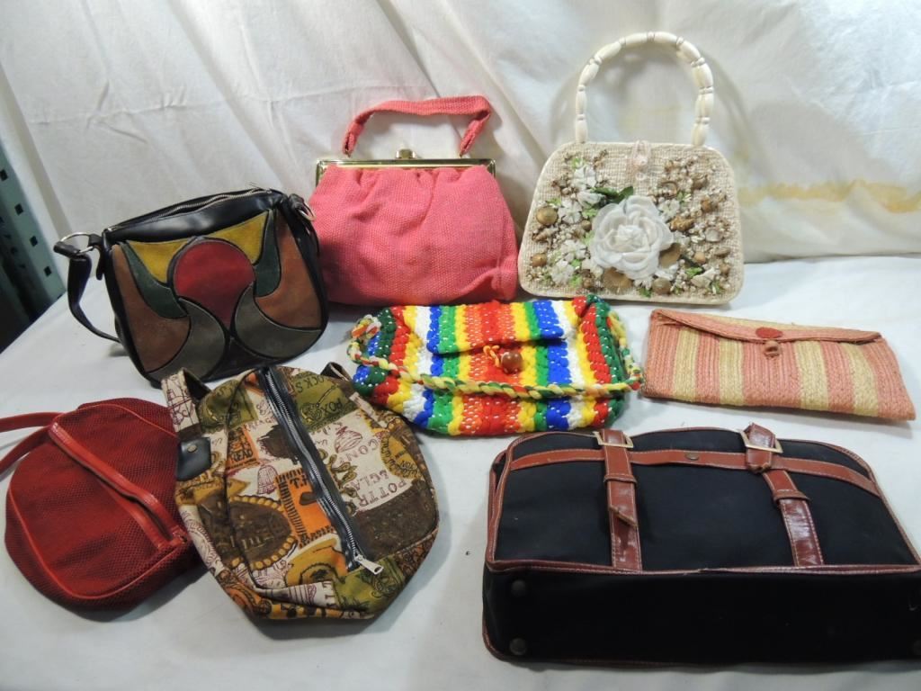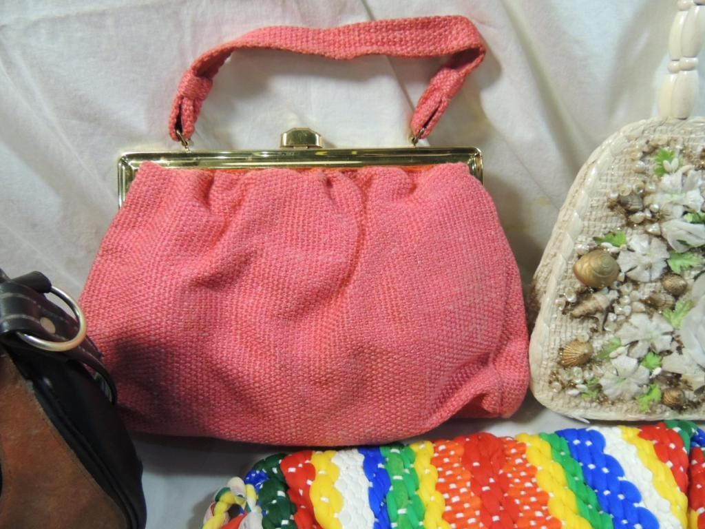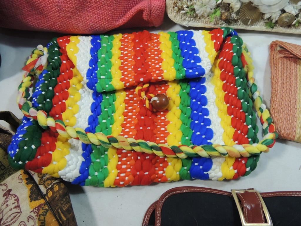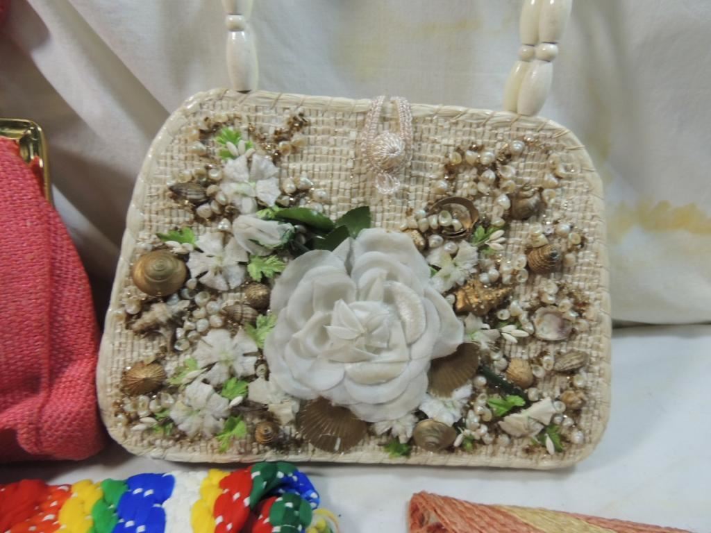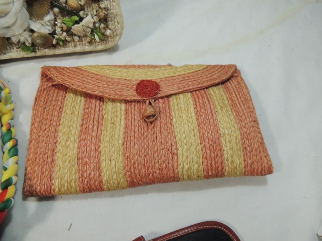 STRAW PURSES, WOVEN PURSES, LEATHER WORK PURSES, VITNAGE ASSORTED STYLES AS SHOWN SEE PHOTO FOR MORE DETAILS.