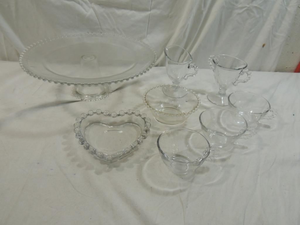 CUPS, CREAMER, CAKE PLATE, CAKE PLATTER, BOWL, HEART DISH, AS SHOWN SEE PHOTO FOR MORE DETAILS.